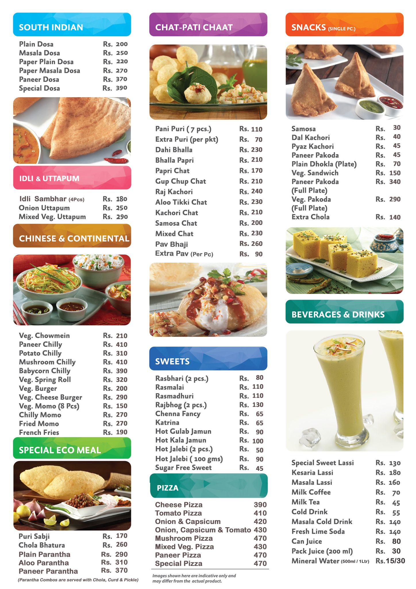 The shop offers a variety of items including traditional sweets (mithai), snacks, namkeens, bakery items, chaats, vegetarian meals, and also some North‑Indian, South‑Indian, Indo‑Chinese and continental dishes.