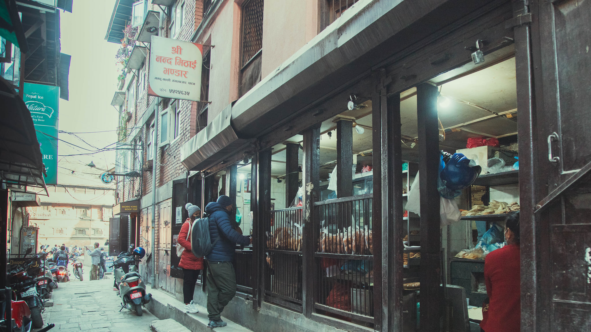 Shree Nanda Mithai Bhandar is a traditional confectionery / “mithai pasal” located in a small alley behind Krishna Mandir, in the lane called Mo: Madu Galli (also spelled “Momarugalli”) / Mangal Bazaar, in Patan Durbar Square area, Lalitpur (near Patan).