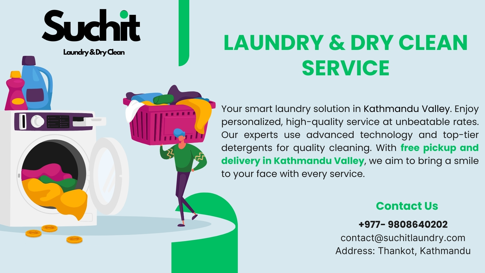 Suchit Laundry & Dry Clean is a full-service garment-care company based in Thankot, Kathmandu, Nepal. They strive to offer a smart, reliable laundry experience by combining advanced washing technology, premium detergents, and professional handling.